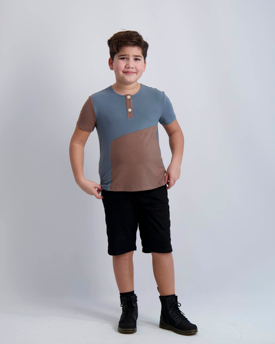 This two button sky and seafoam contrast tee is made from a soft cotton/spandex blend...