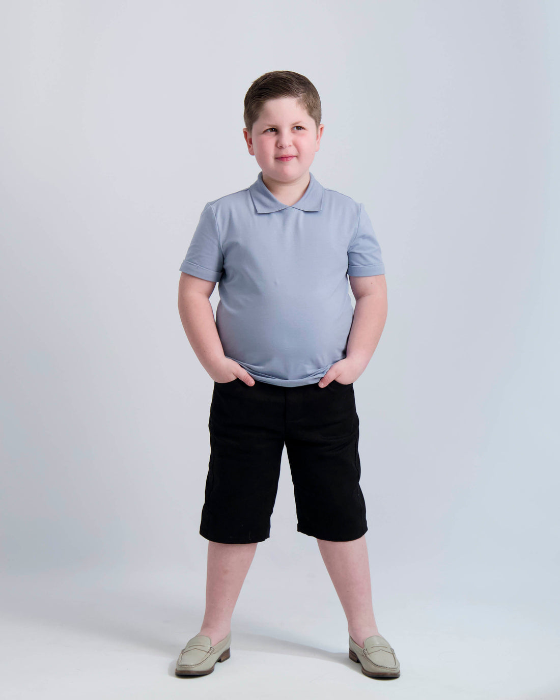 Our steel blue collar top is made from a cotton/spandex blend for a comfortable fit...