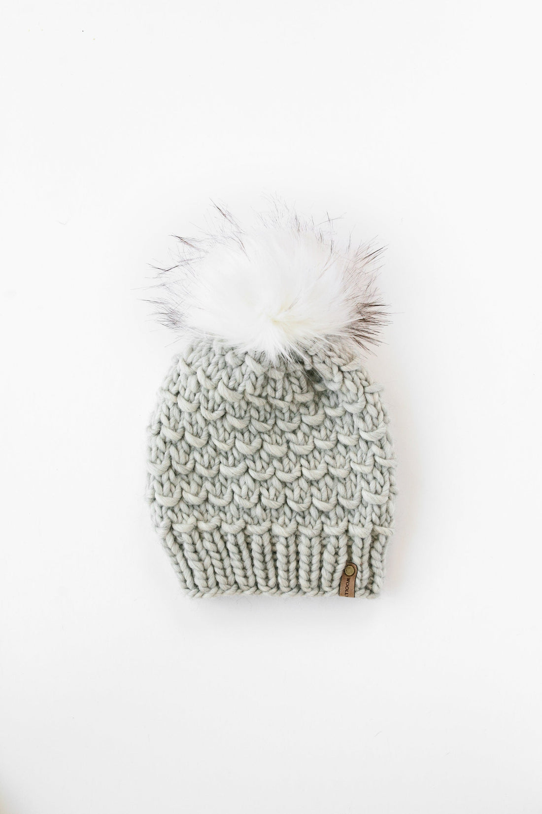 Pearl Gray Merino Wool Knit Hat with Faux Fur Pom Pom