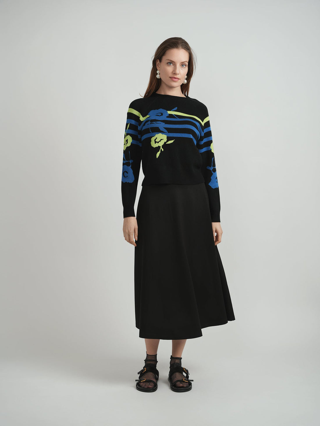 Ladies long sleeve striped knit sweater with floral print at front and sleeves. ֲAvailable in...