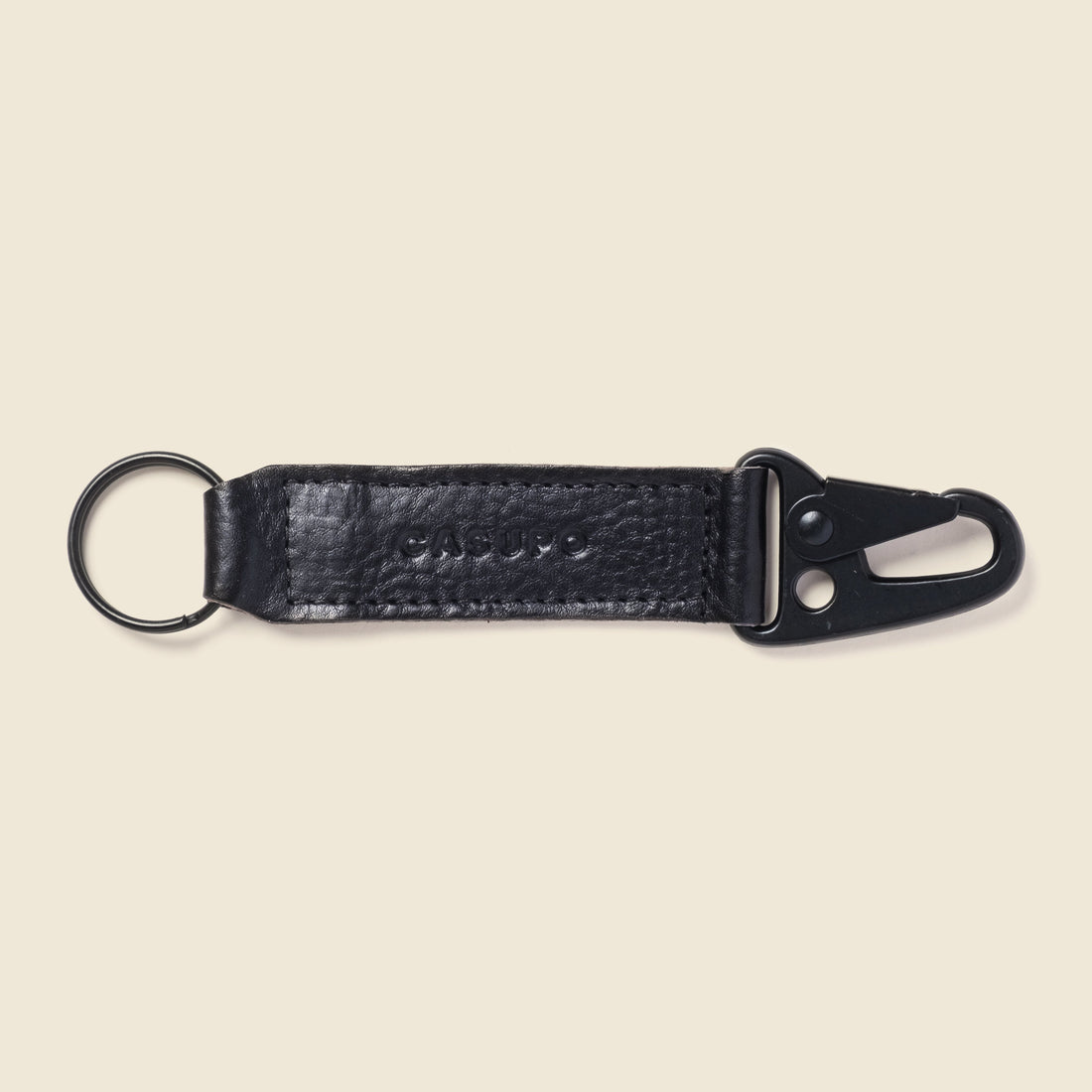New bifold black leather wallet with snap closure and a carabiner ring to attach keys...
