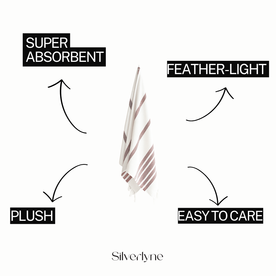 Wrap yourself in the comfort of a spa day—any day. Woven from 100% premium Turkish cotton, our Silverlyne Towels are incredibly soft, lightweight, and quick to dry. Whether you’re lounging on the beach, stepping out of the shower, or traveling light, this towel brings effortless elegance and unmatched versatility. With a plush yet breathable texture and beautiful fringed edges, it’s a modern essential for bath, beach, and beyond.