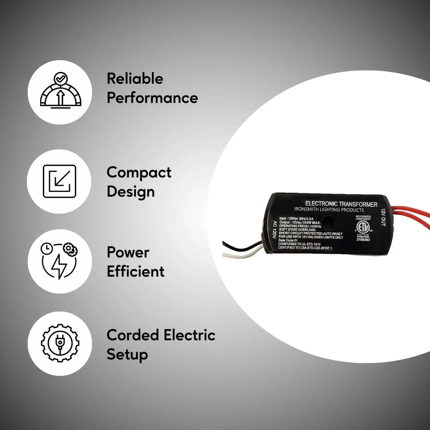 105-Watt Halogen Electronic Potted Mini Transformer are dimmable and fully potted efficiently converts 120 volts to 12 volts (AC/DC), making it suitable for various bulb types, including incandescent, halogen, xenon, krypton, and some LEDs.