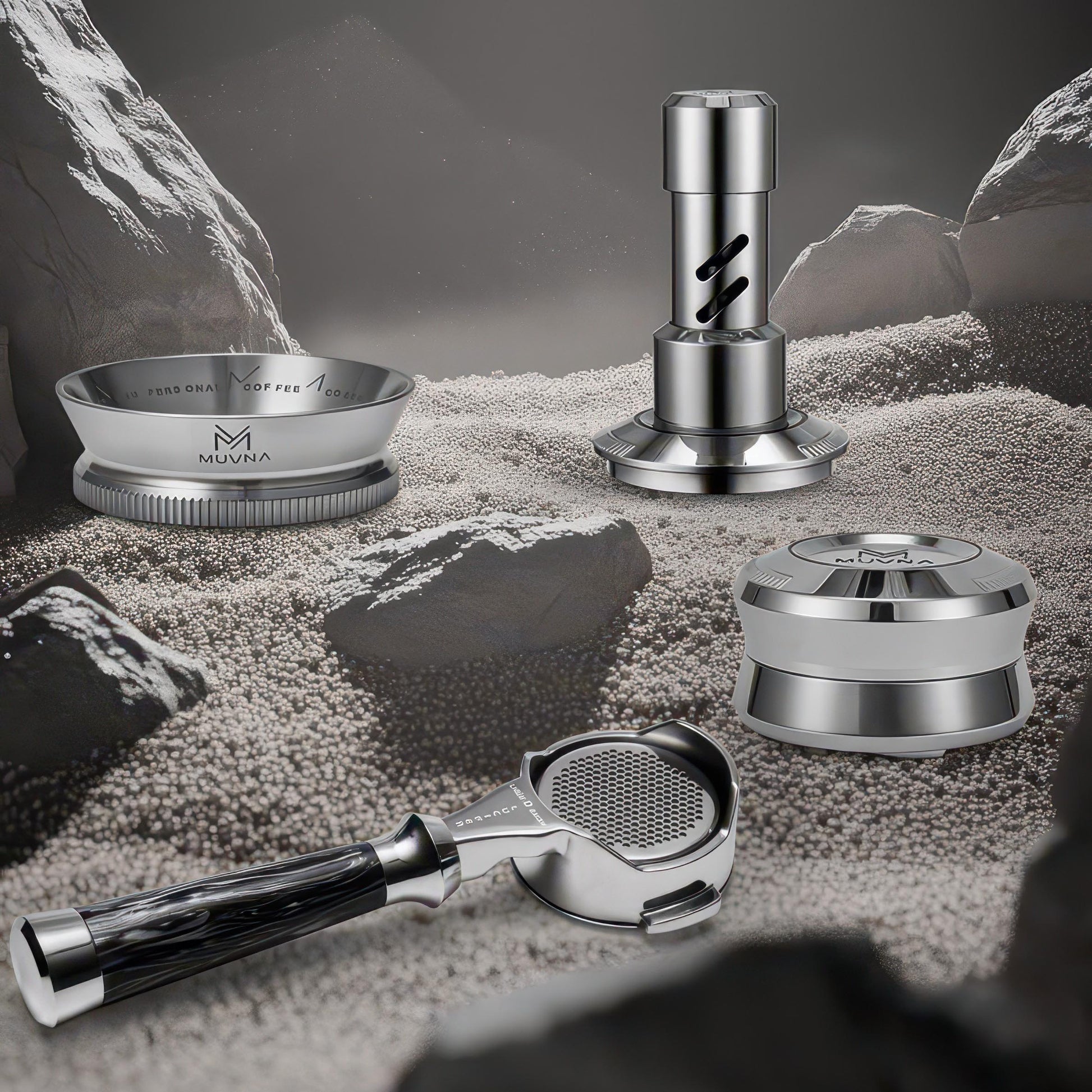 Professional Tamping Accessories: Complete five-tool set for precise espresso preparation including tamper, distributor, funnel, portafilter, and mat.