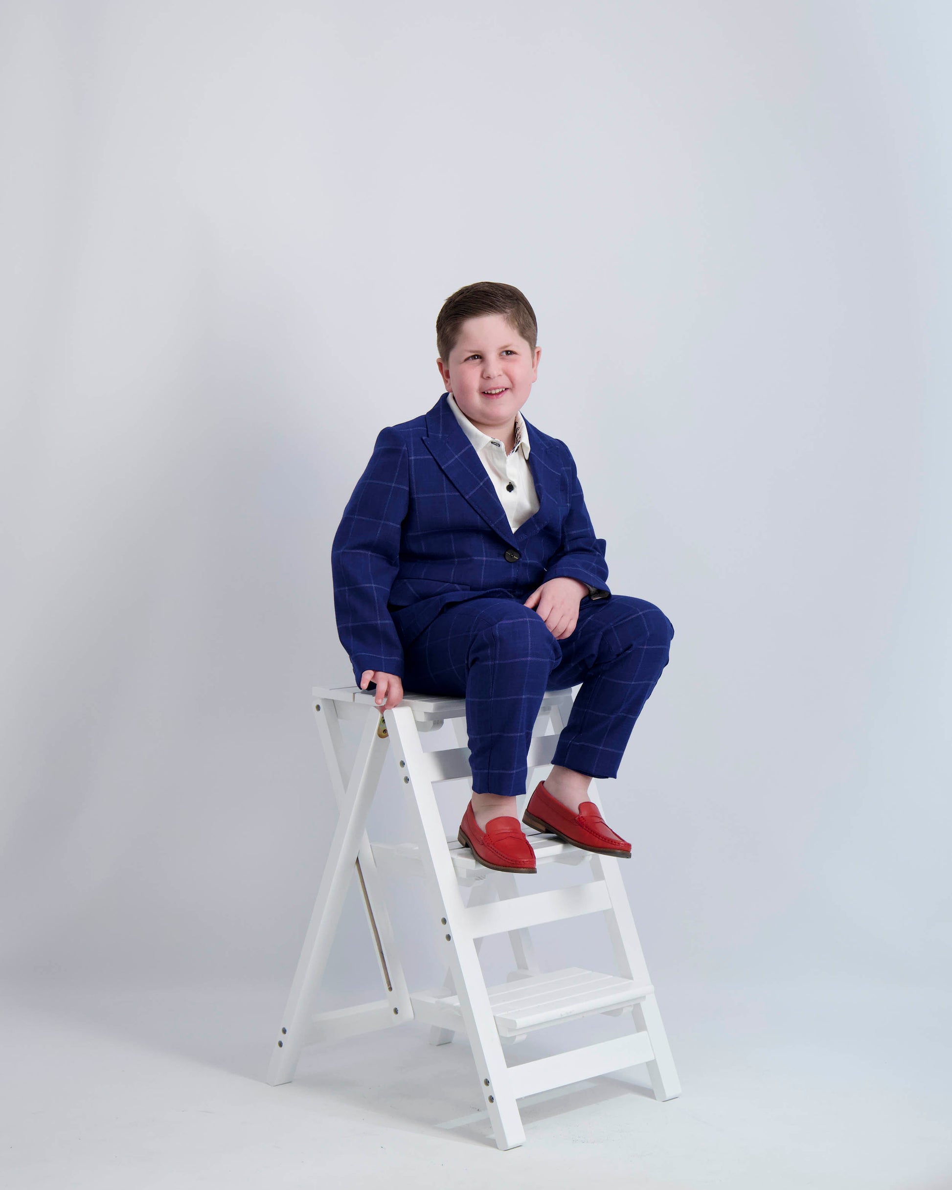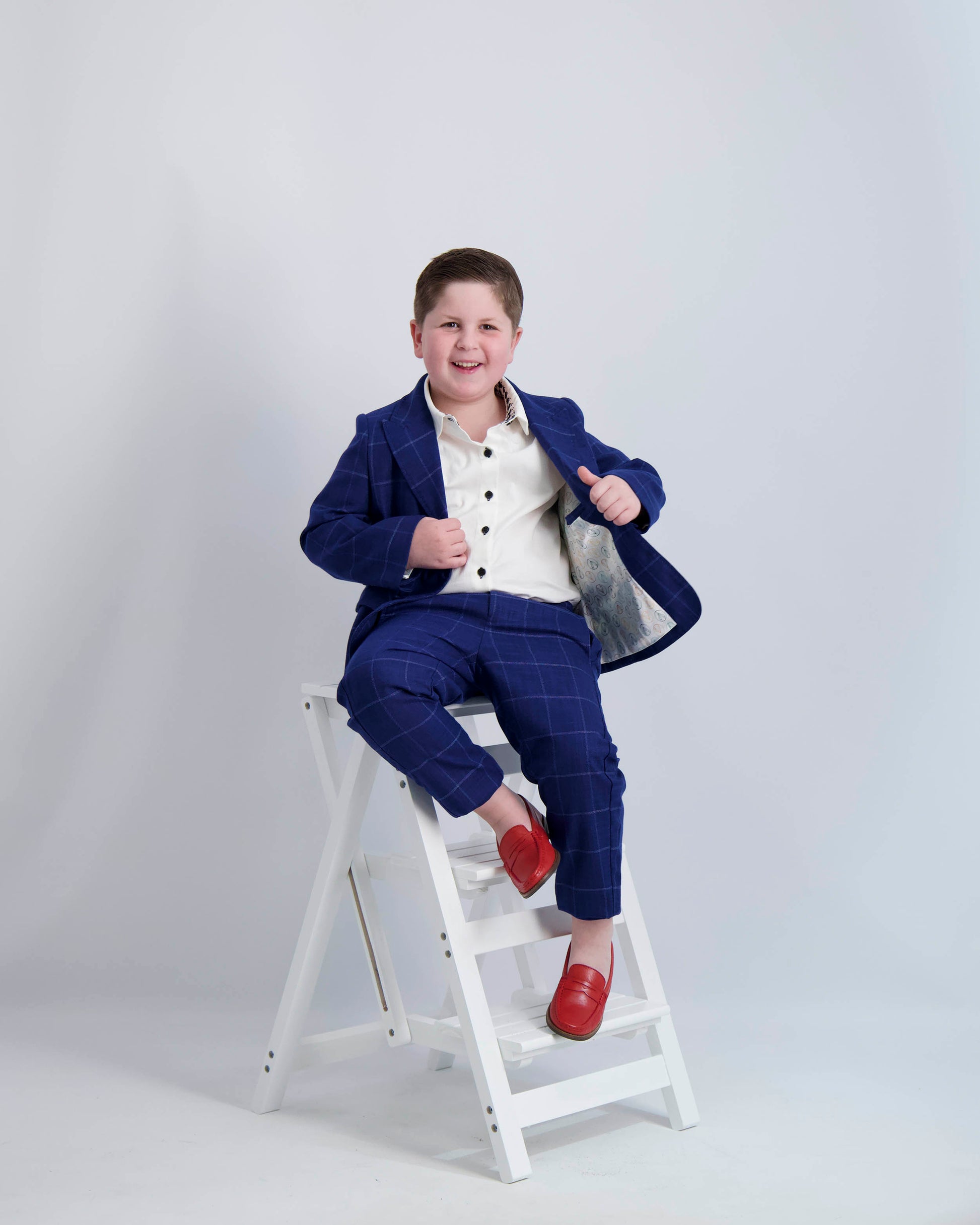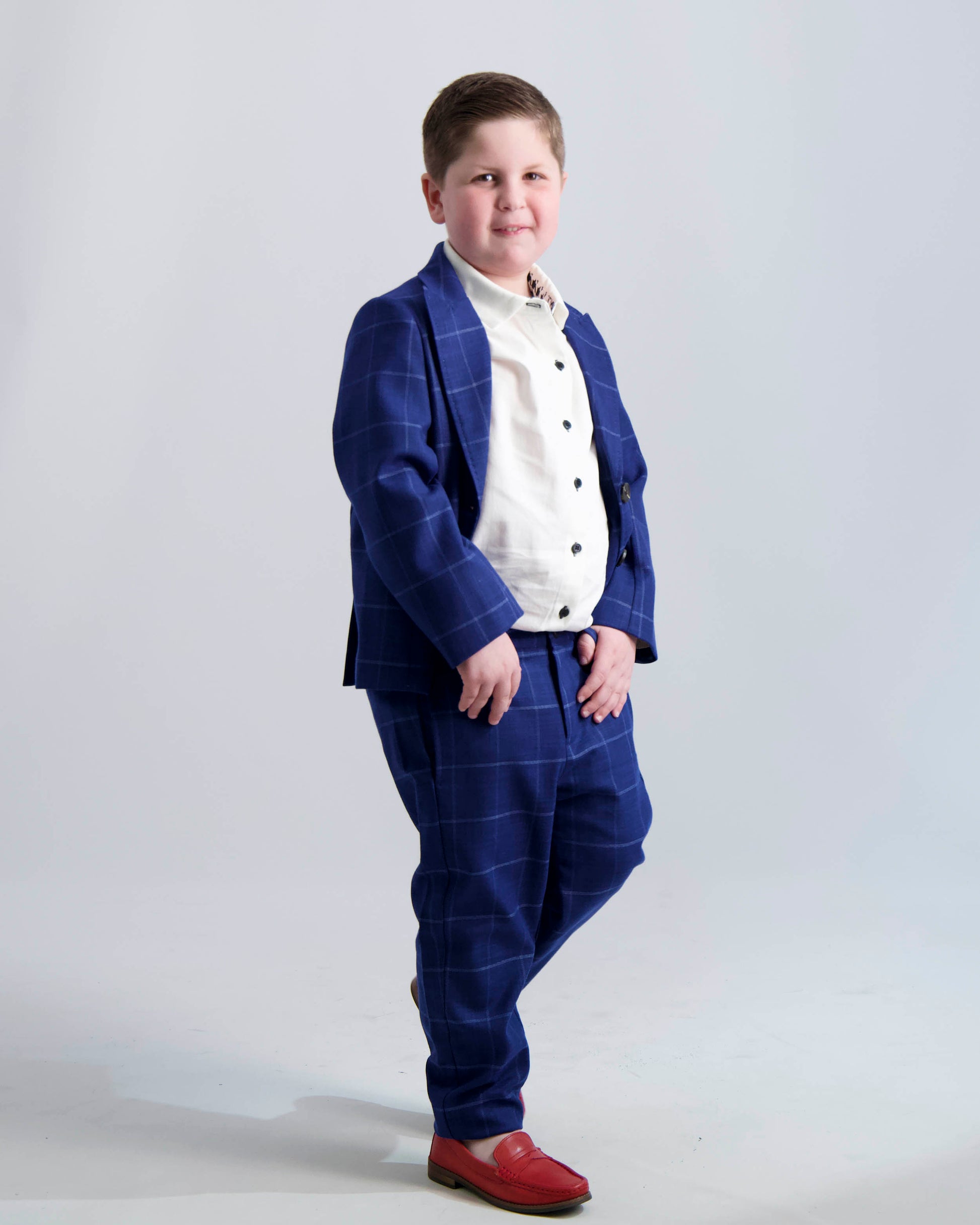 Our tailored blue windowpane blazer for boys makes sure that every boy feels confident and comfortable for every occasion. Pair with our button dress shirt, and matching dress pants for a formal look or wear with our casual pants and collared sweater for a more laid back vibe. Wide sizes are 2 inches wider than regular sizes. See sizing chart for reference.