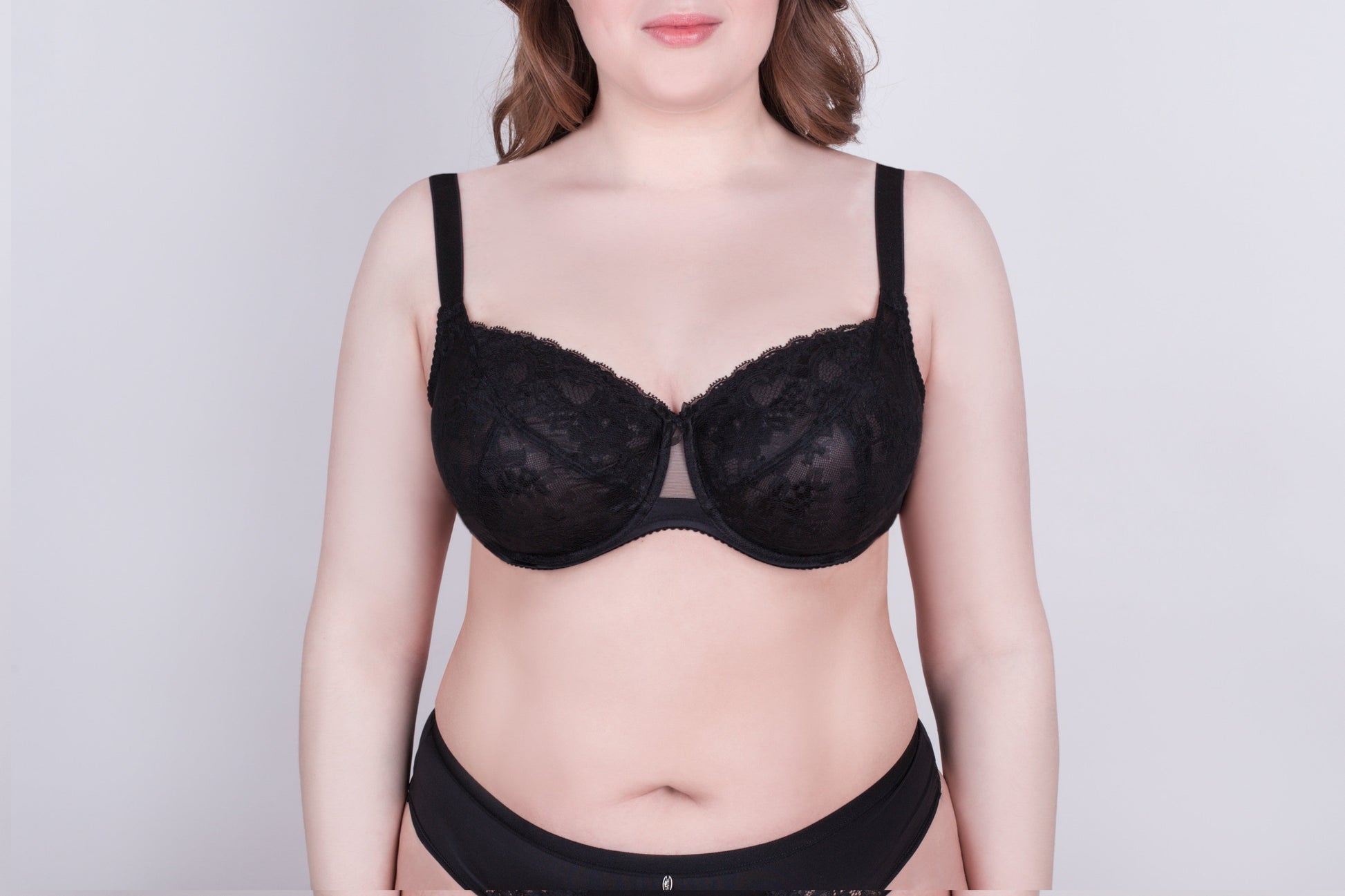 A classic bra made from non-elastic lace fabric and elastic knit fabric. This underwired model features soft cups with triple diagonal segmentation and mesh fabric lining. A decorative transparent insert on the central part of the bra, embellished with bows. The closure has 2 hooks in 4 rows, allowing for easy fastening and ensuring comfort and a beautiful fit.