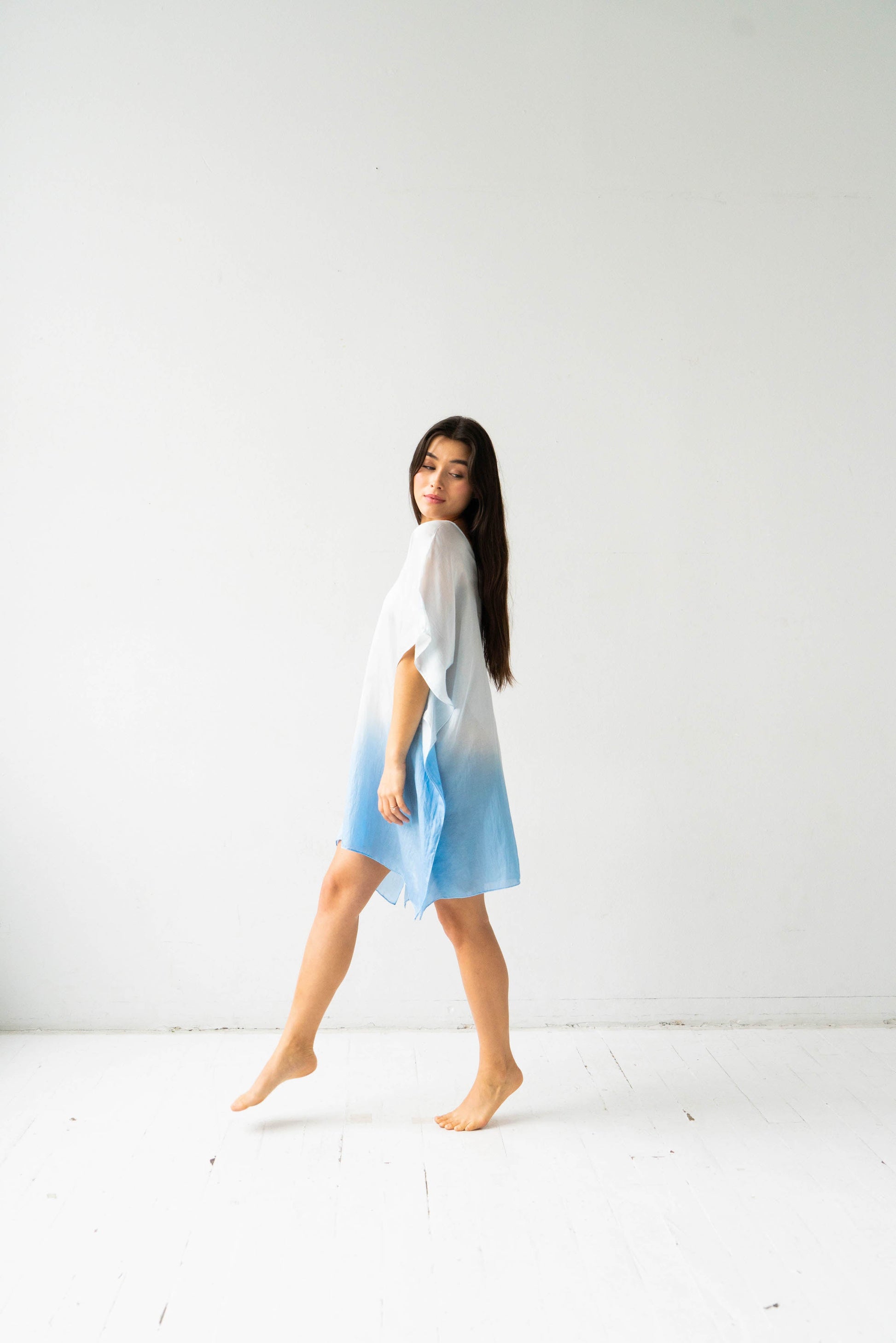This gorgeous kaftan is made in our classic cotton/silk giving it a luxurious feel and drape. It is one size and fits sizes 0-14 comfortably. It comes with an optional waist tie. Shown here in gradient navy. Our gradient colors are dip dyed by hand making each one unique!