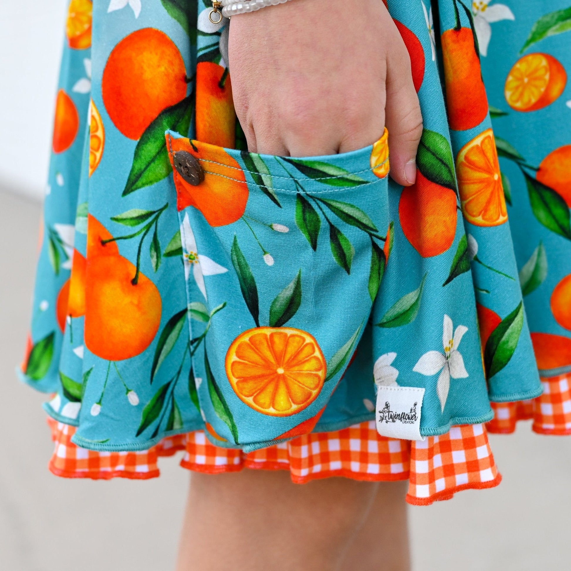 - Vivid Clementine Print: Adorned with a cheerful pattern of bright clementines and lush leaves against a teal backdrop, this dress is a wearable piece of art.