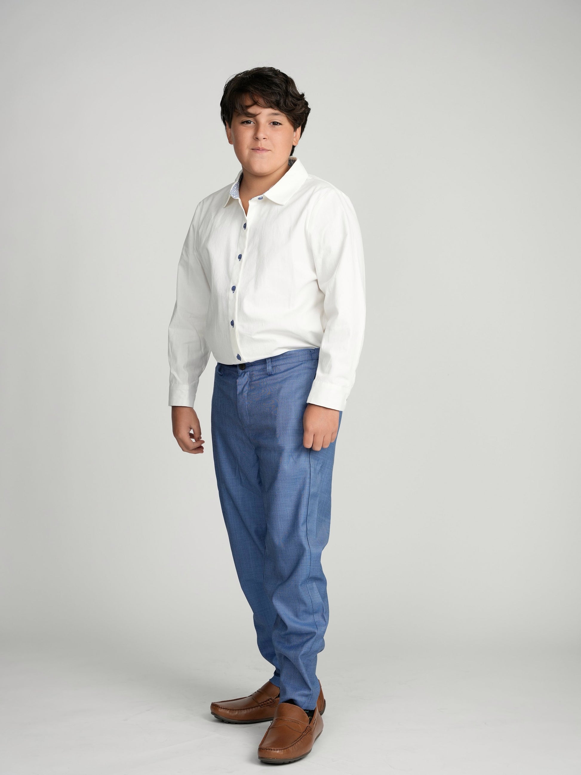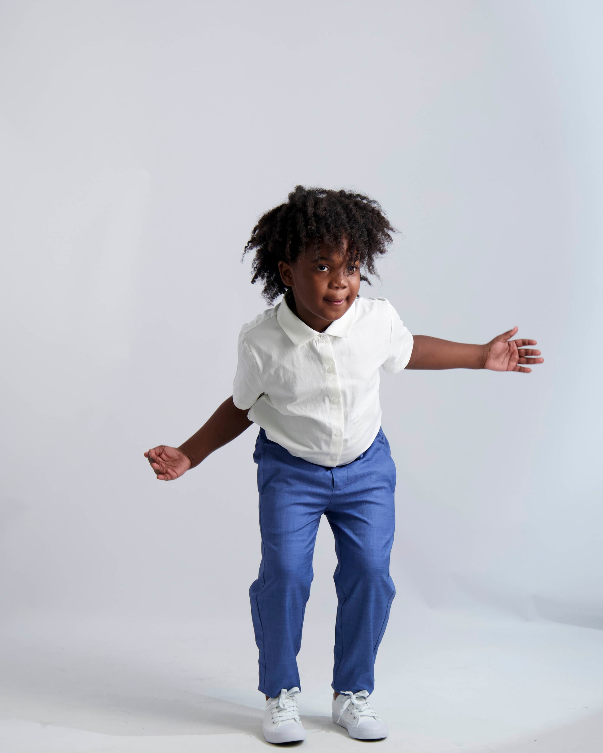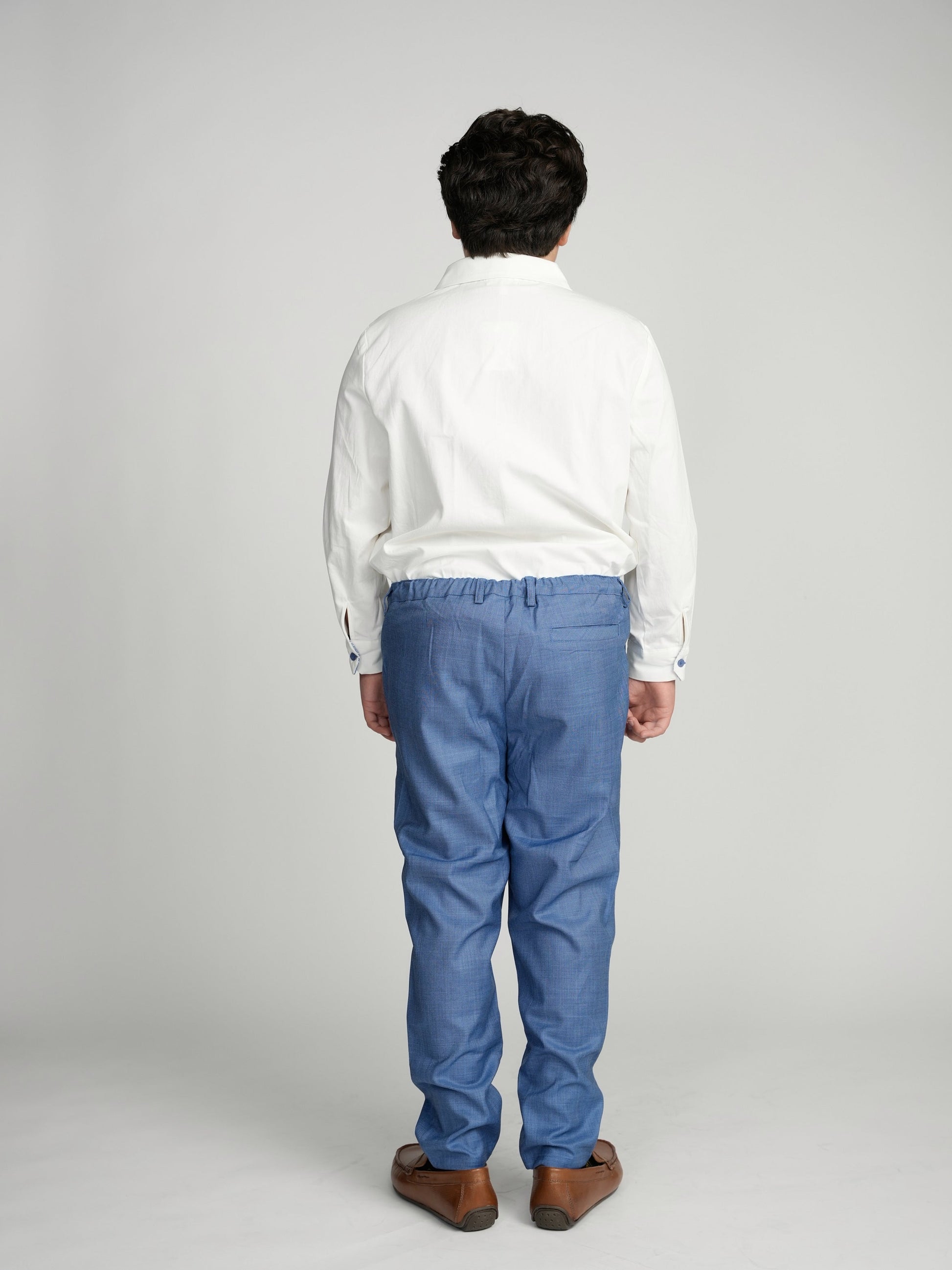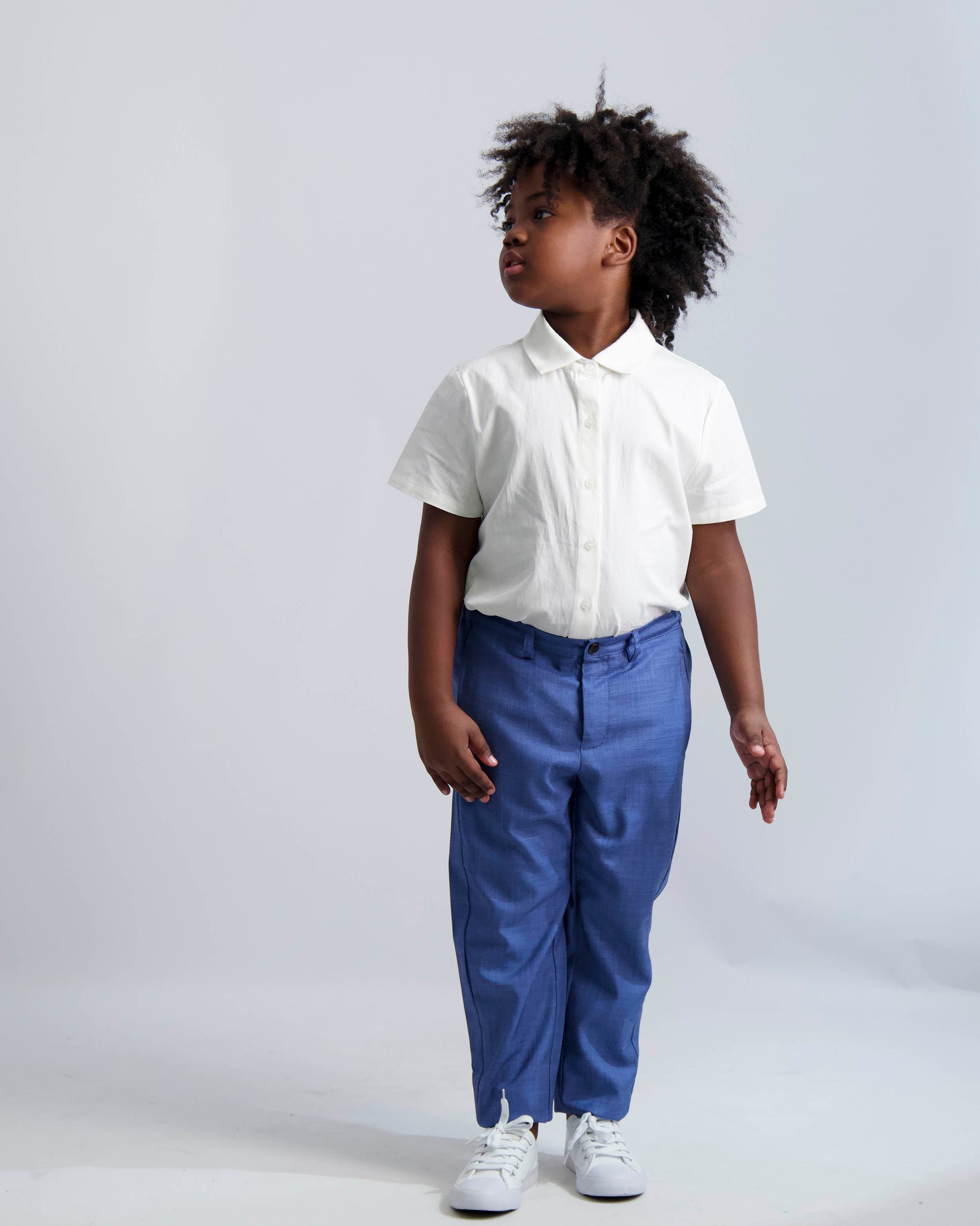 Our Egyptian blue dress pants for boys fall below the knee and have an adjustable waist line for the perfect comfort and fit. For a dressier look pair it with our matching blazer and blue buttons white shirt or for a casual look try pairing it with our collar or piping sweaters. Short sizes are hemmed 1 inch compared to regular sizes. See sizing chart for reference.
