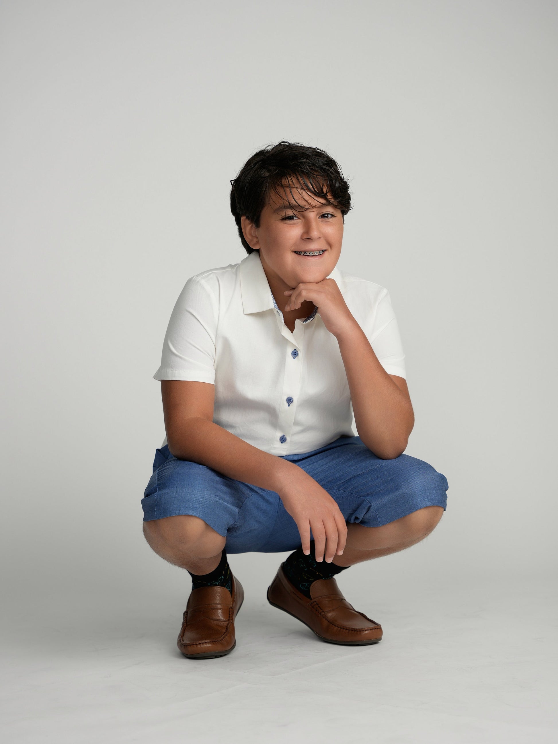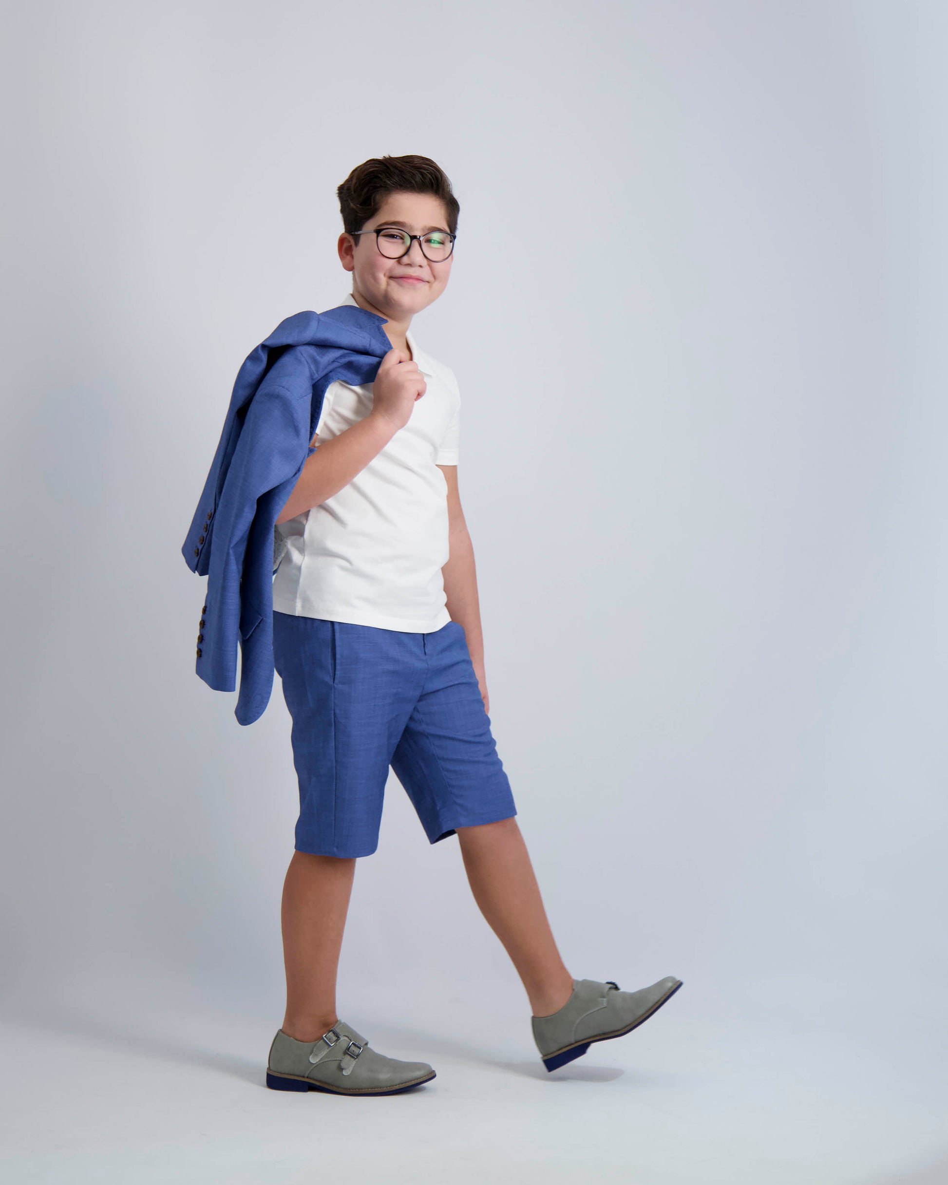 Our Egyptian blue short dress pants for boys fall below the knee and have an adjustable waist line for the perfect comfort and fit. For a dressier look pair it with our matching blazer and blue buttons white shirt or for a casual look try pairing it with our collar or piping sweaters. Short sizes are hemmed 1 inch compared to regular sizes. See sizing chart for reference.
