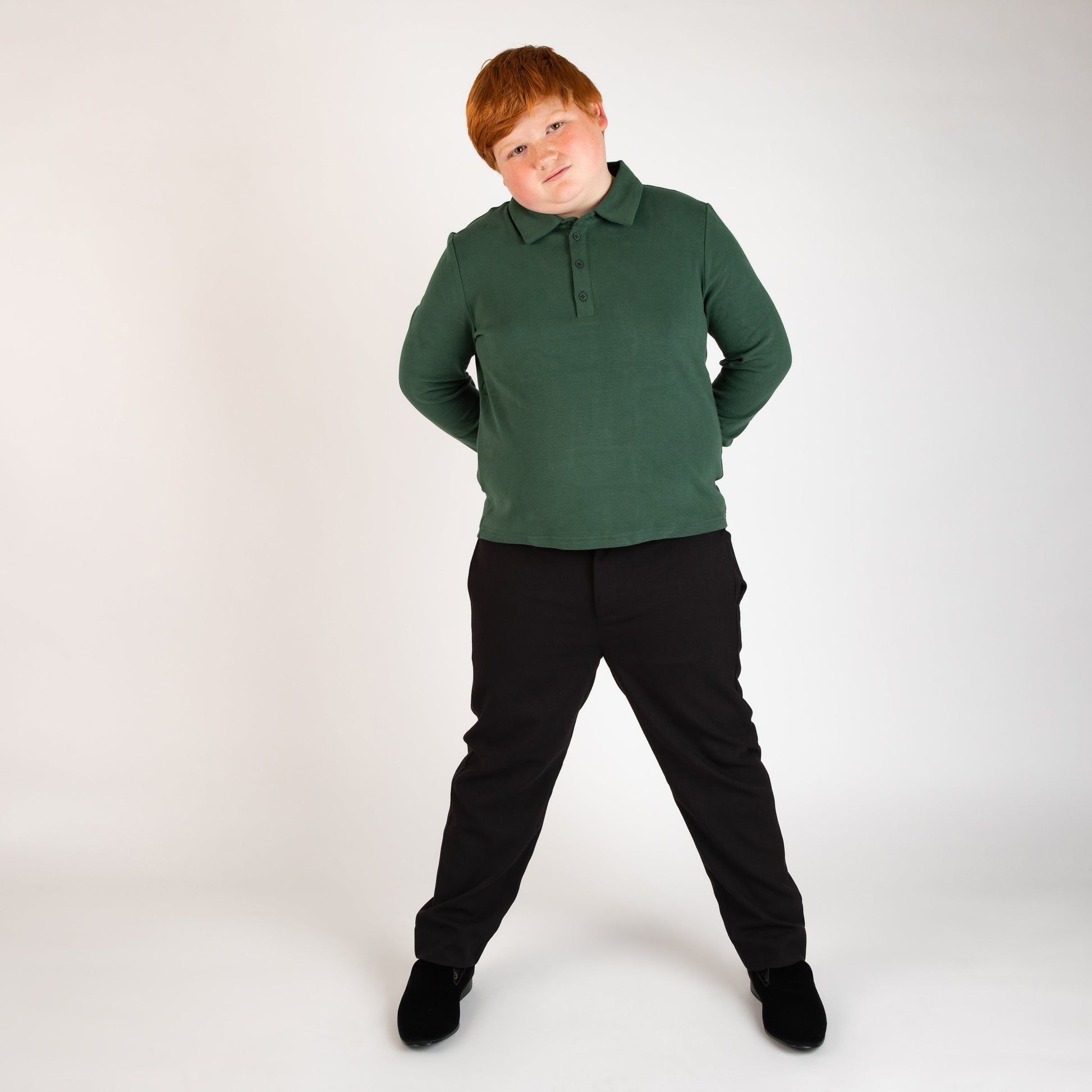 Our forest cuffed polo is made from a deep green cotton/spandex blend for a comfortable fit with a little stretch. With a spread collar, 4 buttons and a cuffed sleeve this polo can be worn to school or used as a layering piece under a blazer for a more formal vibe.