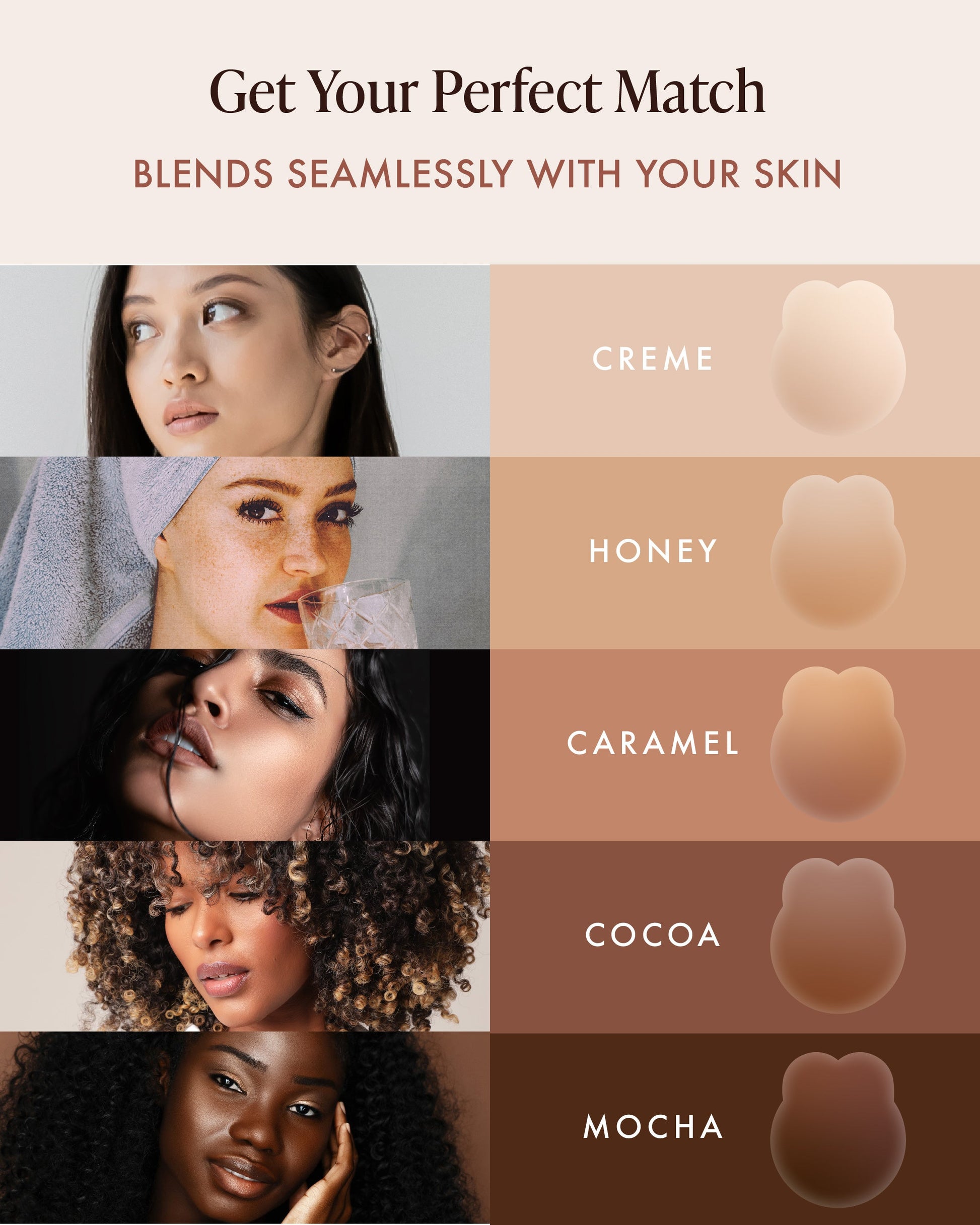 Our Lifting Nipple Covers come in 5 beautiful shades and 2 sizes. Made from 100% medical-grade silicone, these covers are hypoallergenic, reusable, and perfect for sensitive skin. The matte finish ensures seamless coverage, while the ultra-soft material provides all-day comfort. With our nipple covers, you can say goodbye to visible bra lines and hello to confidence and comfort all day long.