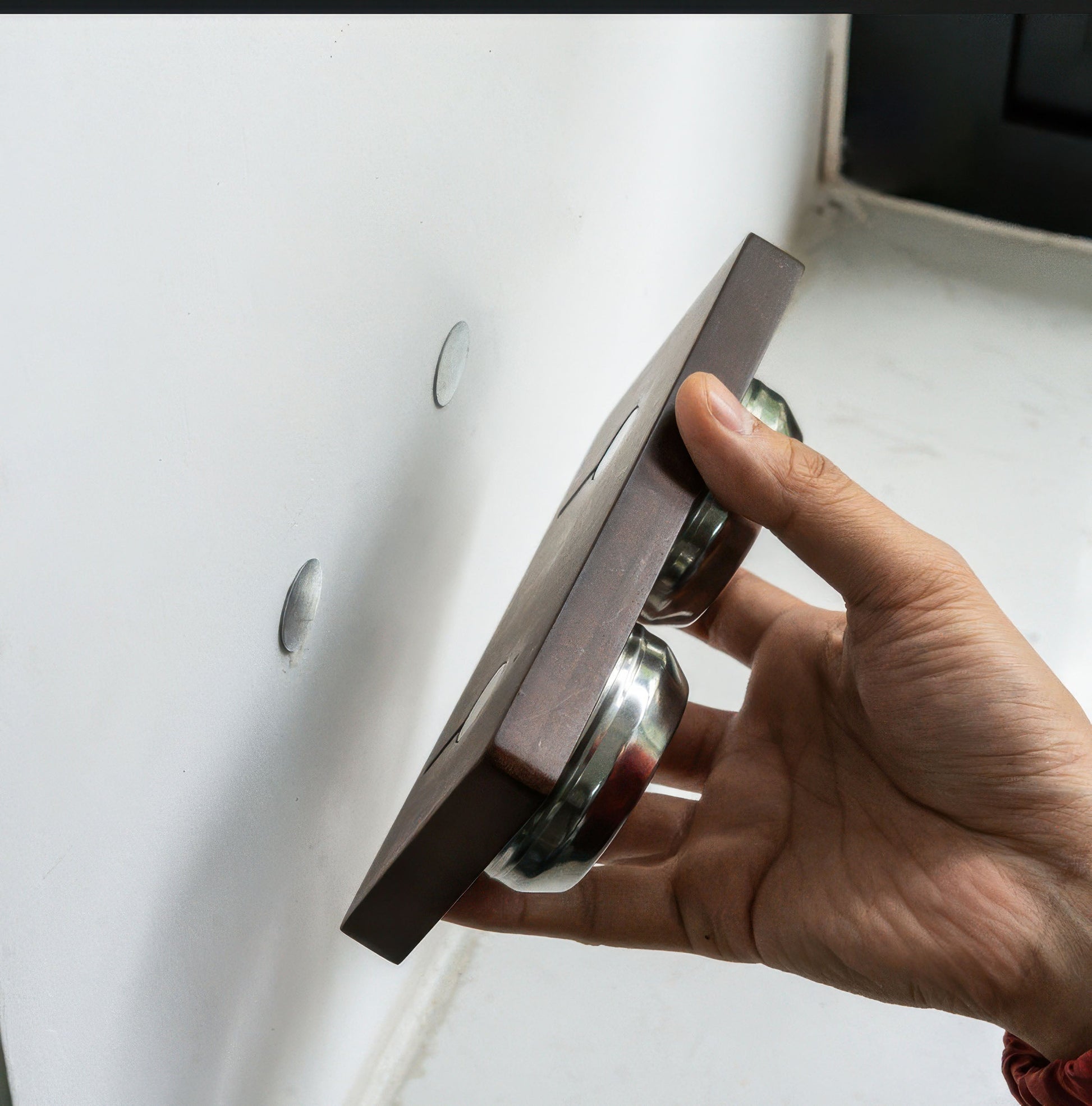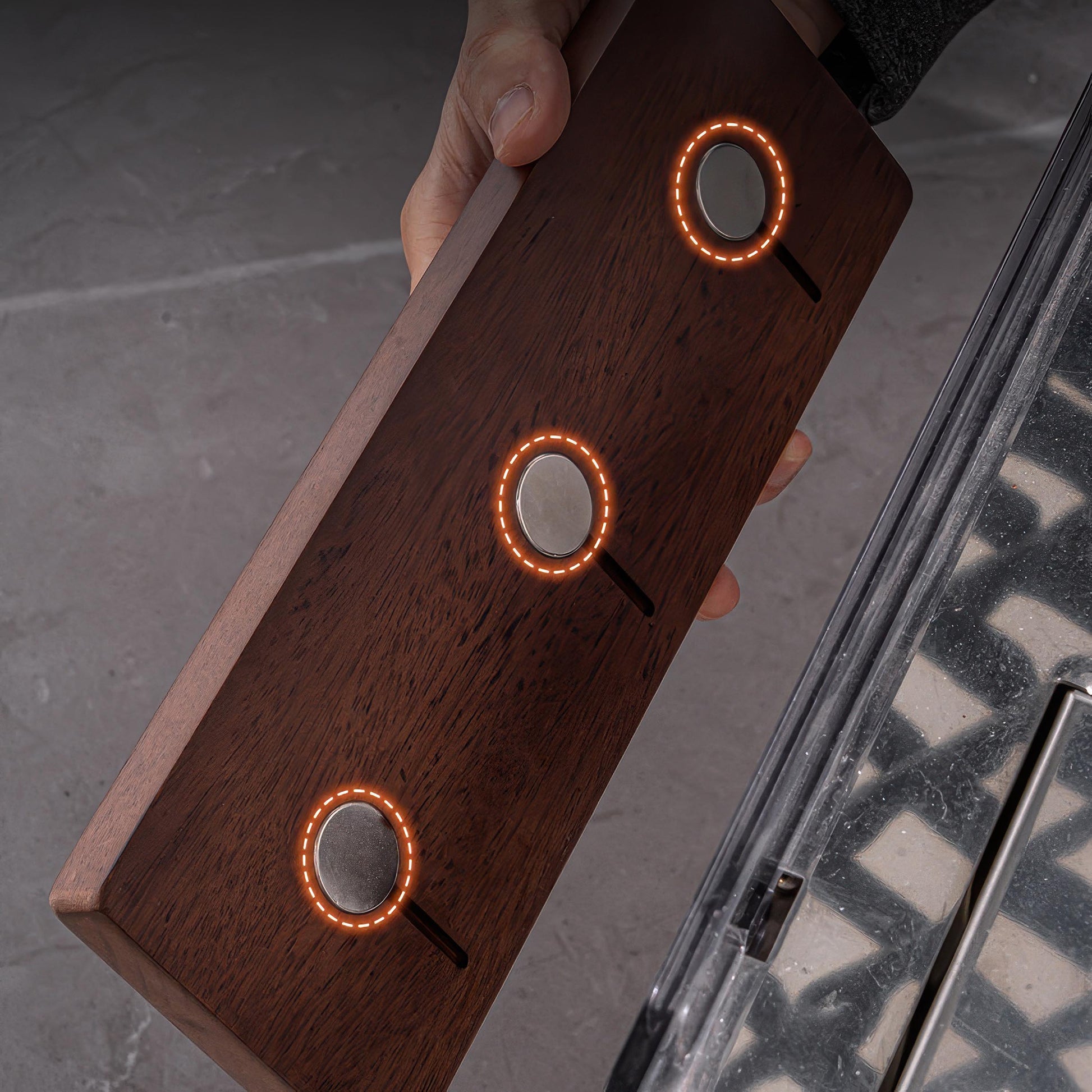 Transform your coffee station with our magnetic espresso filter basket holder . Crafted from premium selected hardwood and featuring powerful embedded magnets, this elegant solution keeps your essential espresso tools organized and accessible. Its thoughtful design adds both functionality and sophistication to your brewing space, ensuring your equipment stays ready for your next perfect shot.