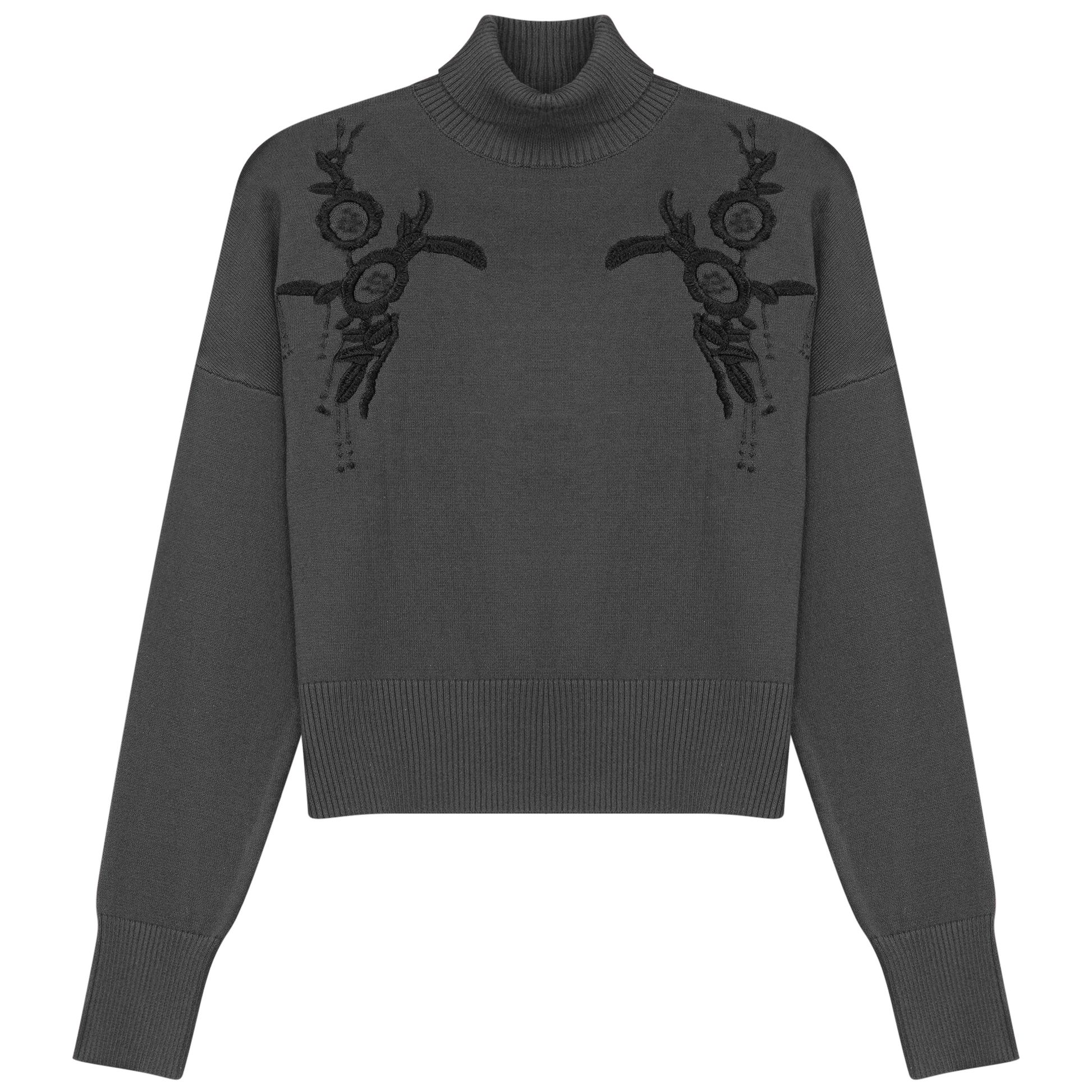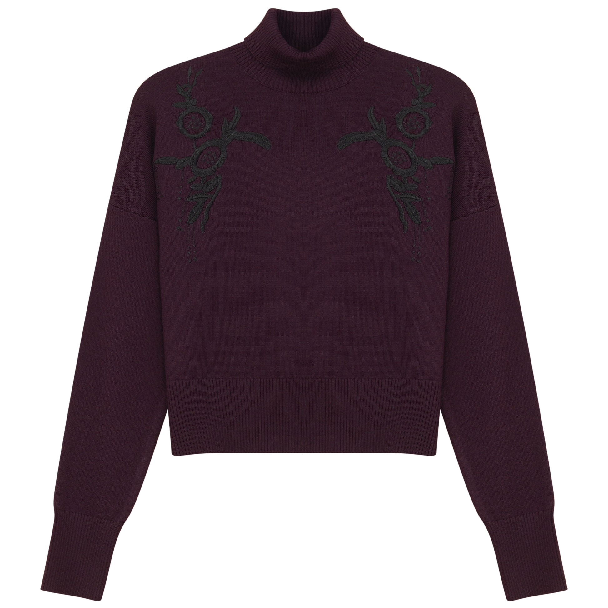 Ladies mock neck knit sweater with front chest applique. ֲ