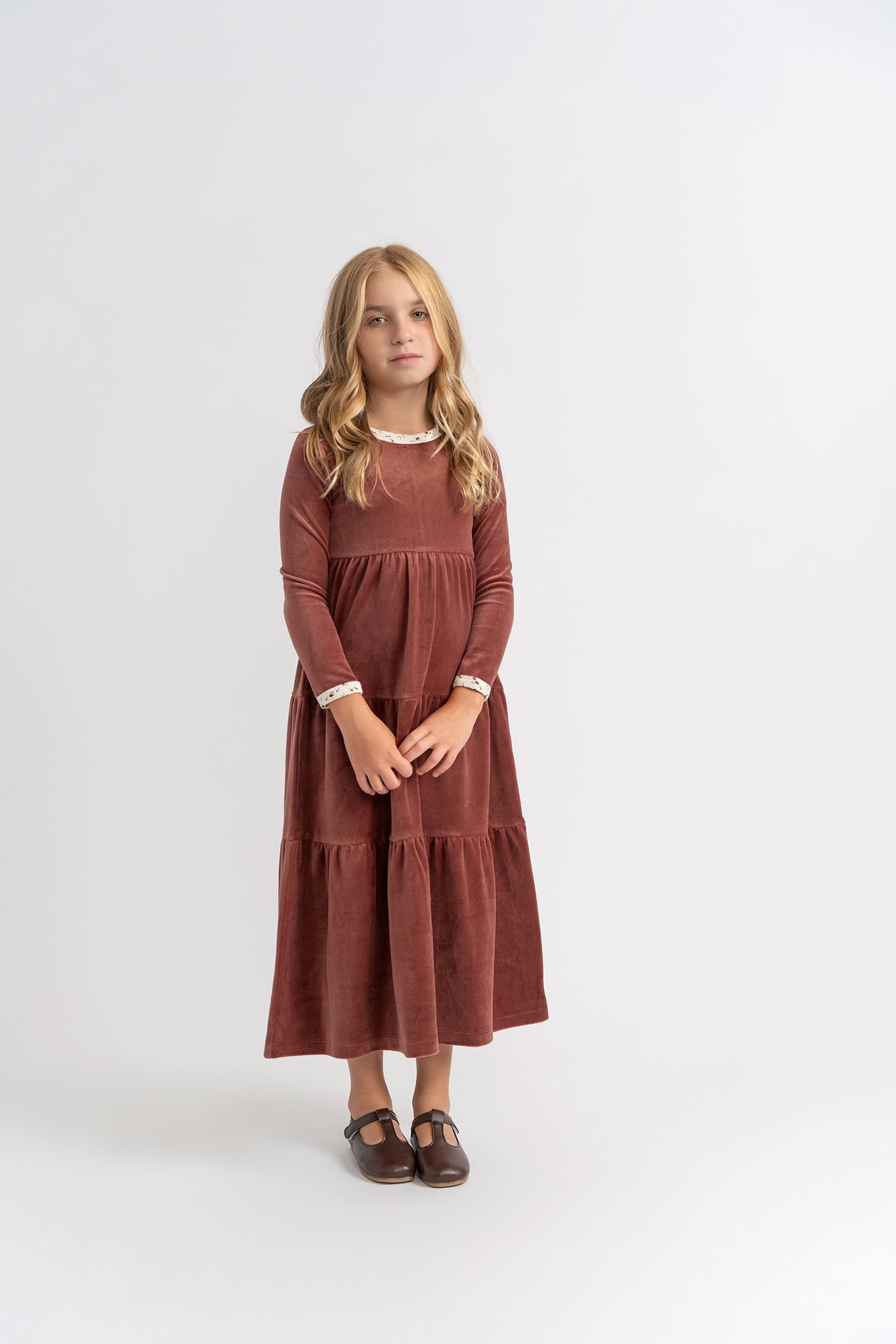 Girls long sleeve velour tiered robe with floral print neckline,cuffs and center back invisible zipper. ֲ