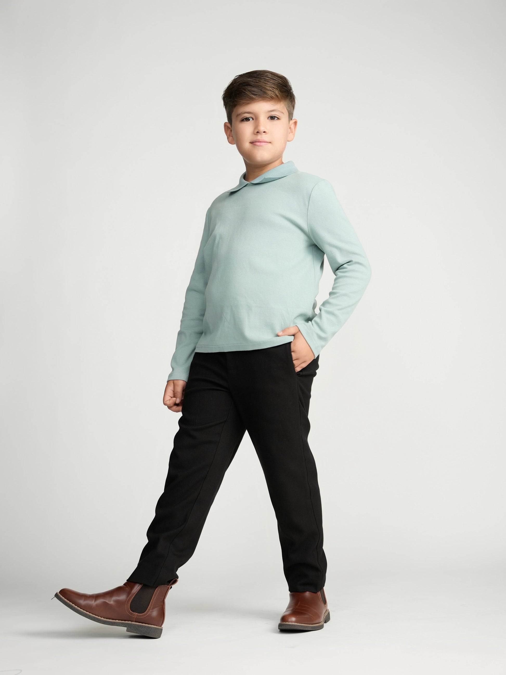Our long sleeve seafoam collar top is made from a cotton/spandex blend for a comfortable fit with a little stretch. This top is similar to the short sleeve collar tops but with a cozier fall/winter feel.