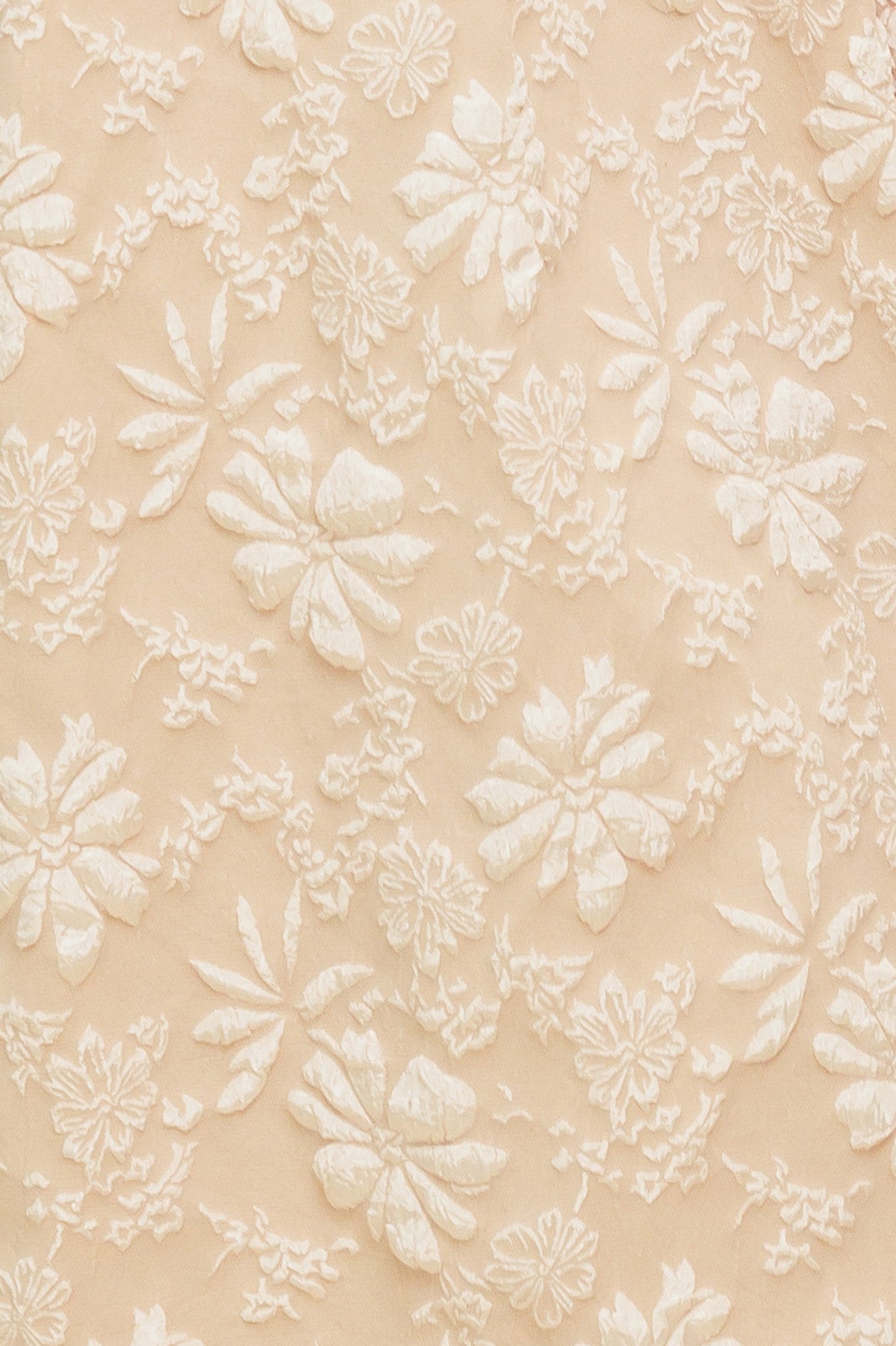 A jacquard woven midi dress featuring straight neckline, straps, front lace up detail, full skirt and smocked back bodice