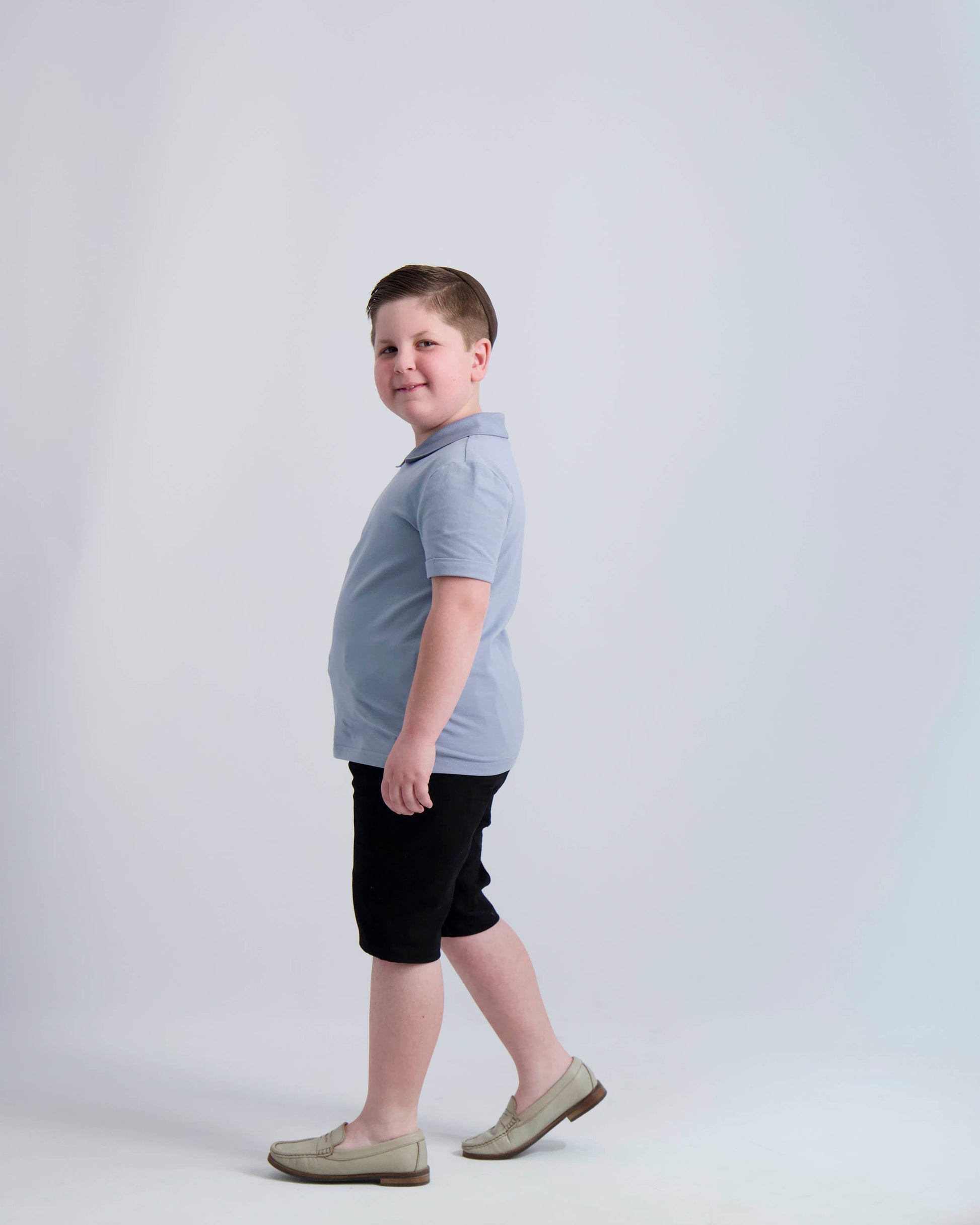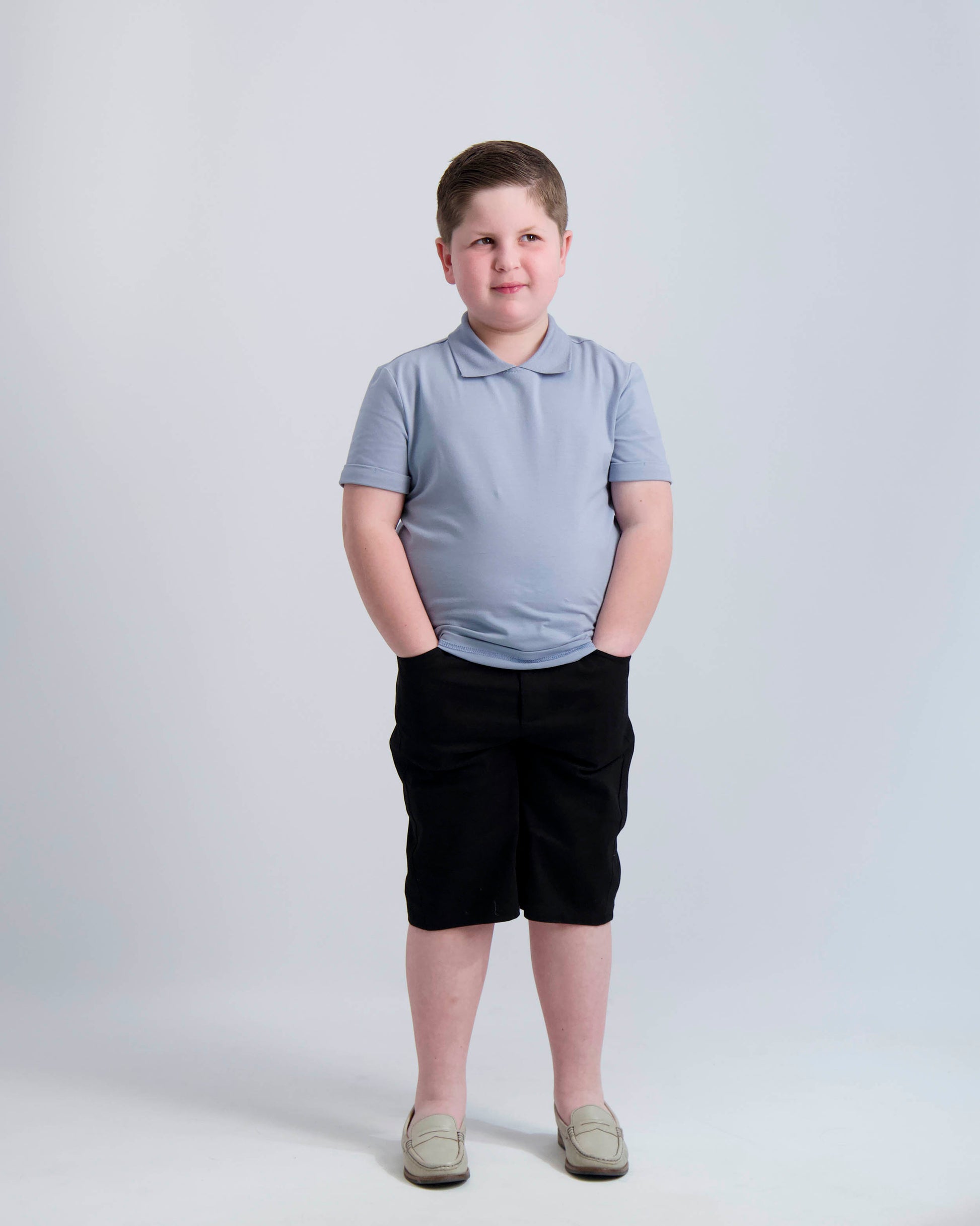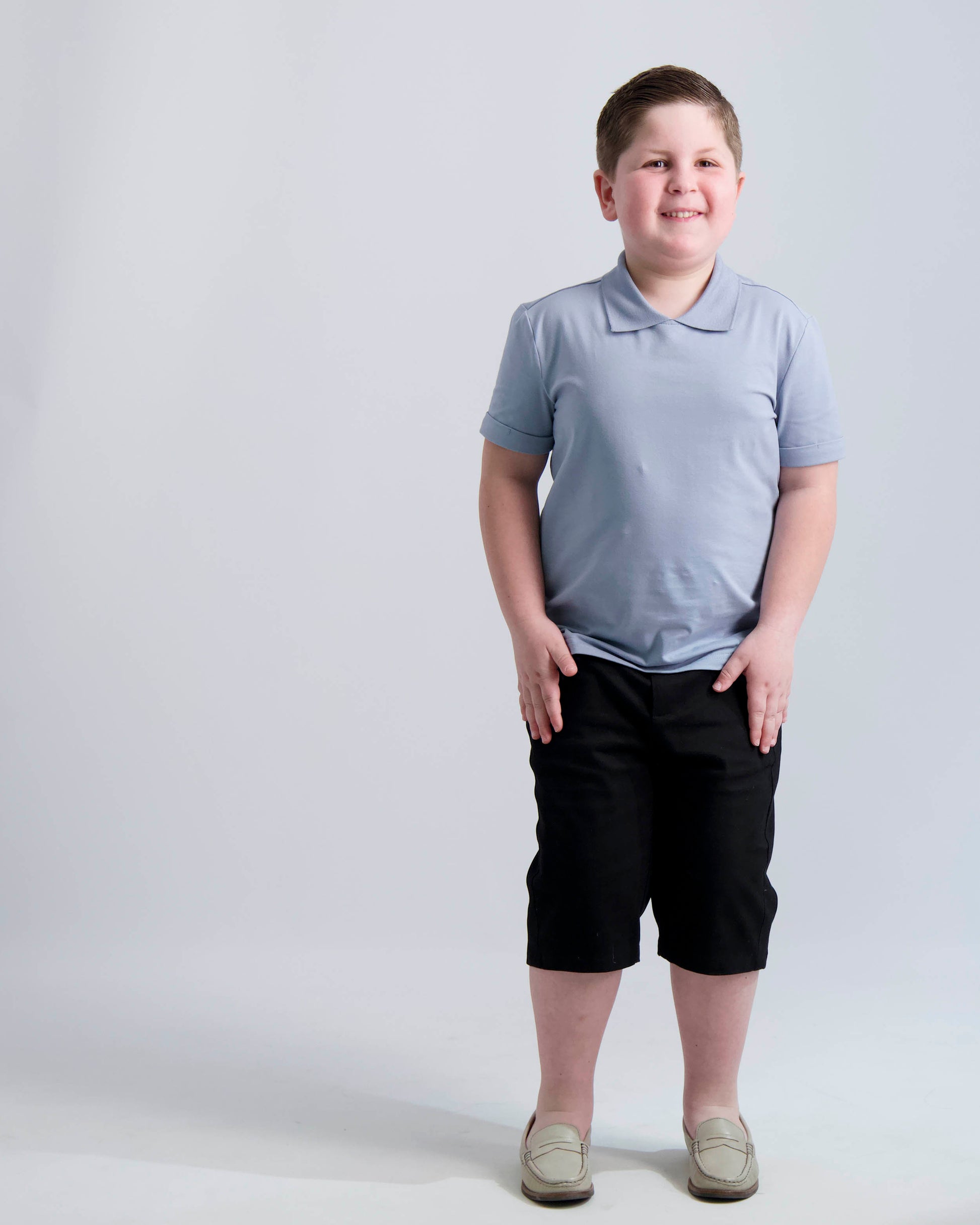 Our steel blue collar top is made from a cotton/spandex blend for a comfortable fit with a little stretch. This top is a great layering piece under a blazer or sweater for that comfortable formal look.
