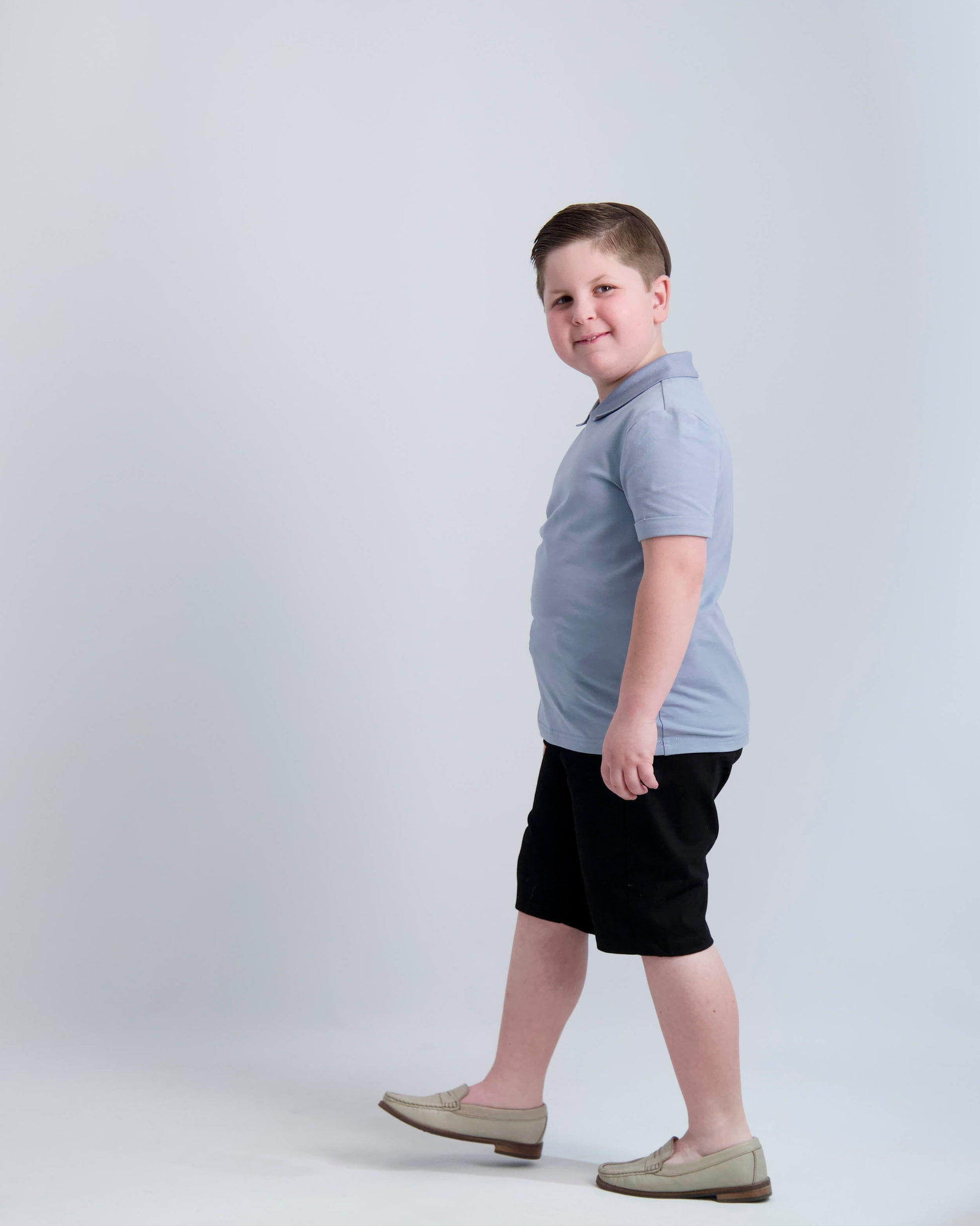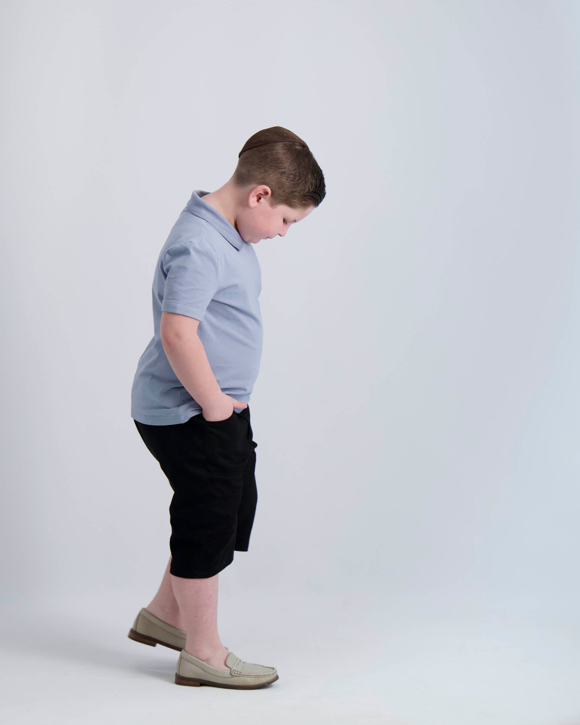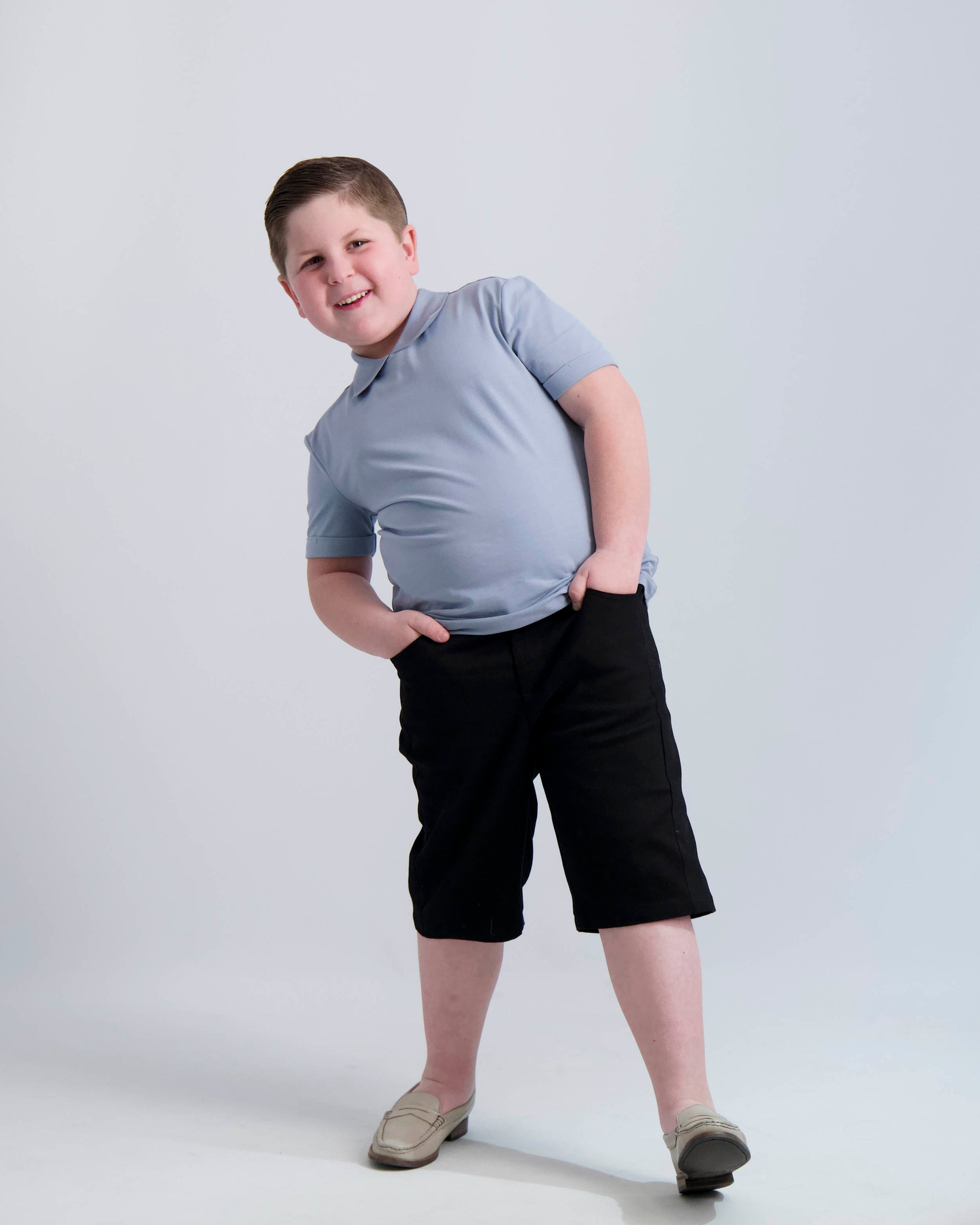 Our steel blue collar top is made from a cotton/spandex blend for a comfortable fit with a little stretch. This top is a great layering piece under a blazer or sweater for that comfortable formal look.
