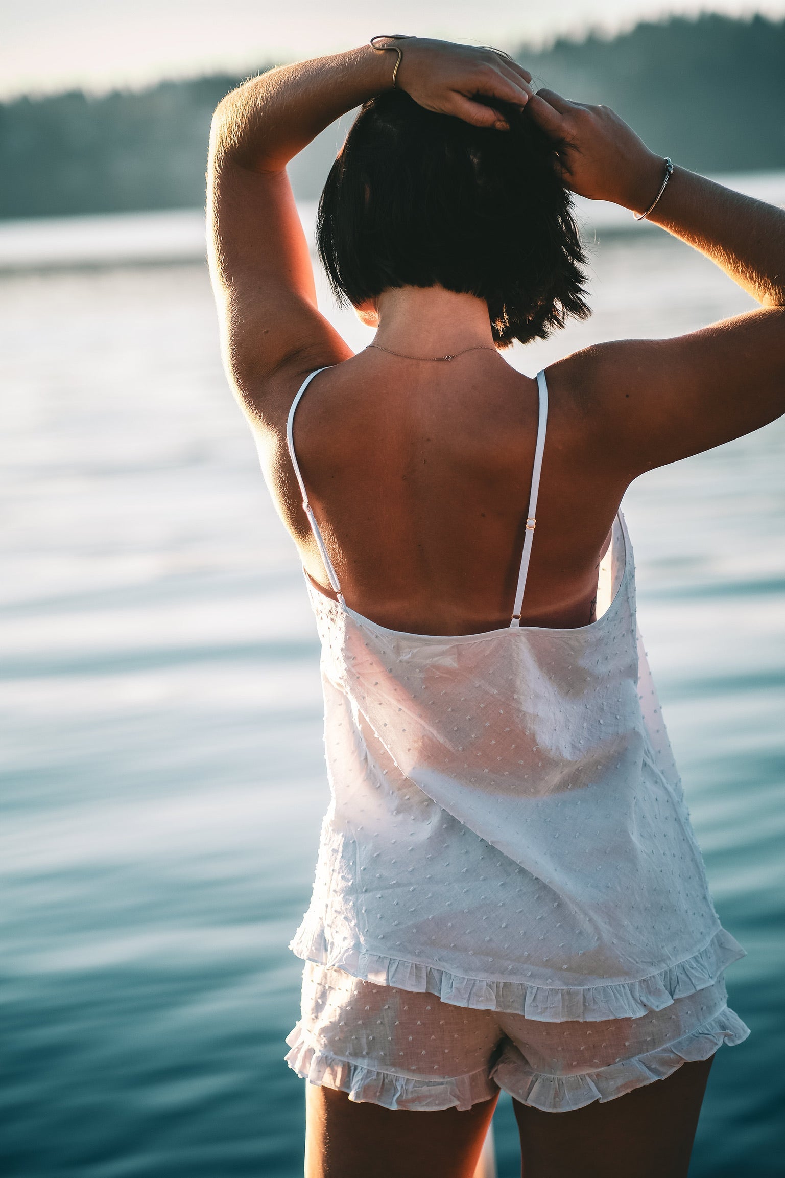 The Swiss Dot Camisole and Shorties are a beautiful set. Its breathable fabric and intricate details provide a fresh feminine look.