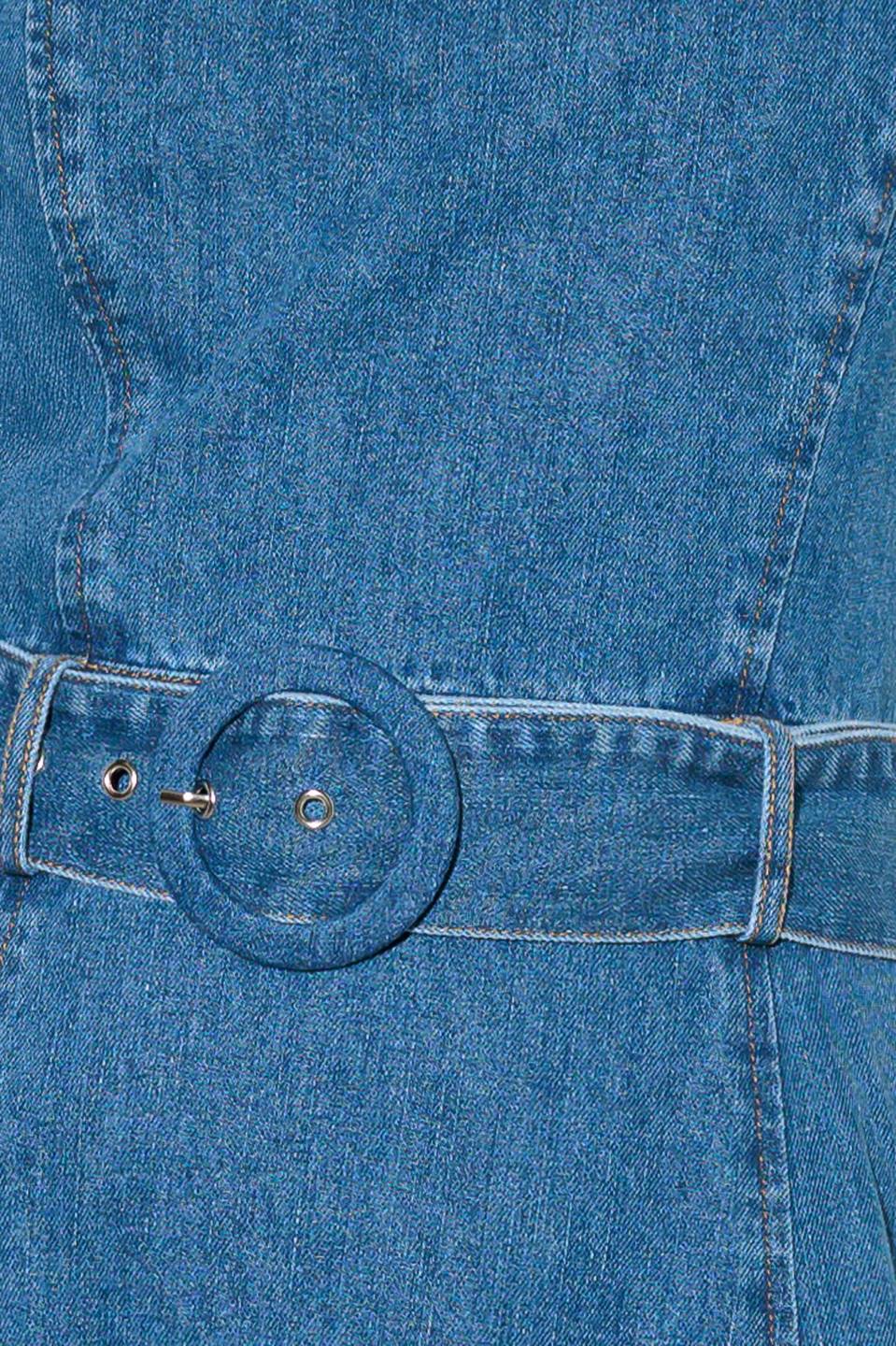 A washed denim midi dress featuring straight neckline, strap, self belt, full skirt and back zipper closure.